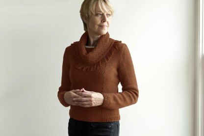A modern shout-out to western wear of the 60’s, introducing Bonanza – a stylish, crewneck pullover, with a detached fringed cowl collar! Worked mostly in stockinette, moss stitch adds texture to front and back panels. Its cropped lengthextends high on the hip with gentle shaping at the waist. This bottom-up design is worked in-the-round to the armholes, then split and worked flat. Long sleeves are worked bottom-up and in-the-round too, with caps set-in. The matching cowl is worked flat, grafted into a loop, then blocked and fringed – a fun new technique worked simply by unraveling its edges and trimming. Enjoy!