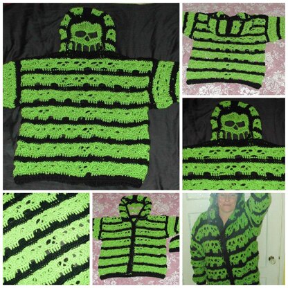 Hoodie style sweat shirt interpreted in a new and different way. A pattern of stripes is made up with rows of skulls and plain bands. As if that wasn't enough, pull up the hood and a large peek a boo skull appears. Many pictures illustrate the stitches. Written in American Crochet Terms Some people are finding the hood is too shallow. To add width, make 3 skull patterns across the front sections instead of 2. Do not skip any stitches when working the first row after the collar.