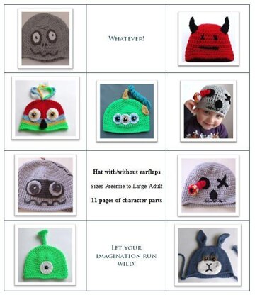 This 22 page pattern booklet contains full instructions for the hat base and 11 pages of character parts to make any of the hats shown (and potentially hundreds more).