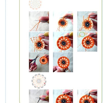 A very easy bookmark, really suitable for a beginner crocheter, and it is quick to make. The main crochet part is made from the basic stitches (slip stitch, chain, double crochet). We add a simple braid decorated with some beads to give length to the bookmark. It is proposed here in warm color but it can be made in other colors, preferably well contrasted to highlight each circle made. To avoid buying several whole balls, you can use skeins of embroidery thread of equivalent size (n°10). The final step of "blocking" (moistening and stretching with needles) is important to obtain a more regular result. The different steps are presented in the PDF with the help of 6 diagrams (one main and 5 detail) and 62 pictures.