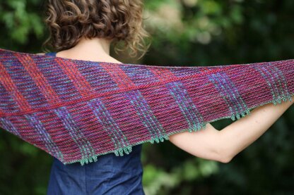 Boomerangle is a long asymmetric triangle designed for experimenting with colour and contrast. The body of the shawl is worked sideways, alternating between garter and stockinette to create a slightly shot fabric, which are intersected by strong slip stitch lines.
