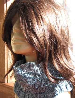 The subtle waves of this cowl, inspired by the ripples on a calm sea, are formed by a variation on the familiar feather-and-fan stitch pattern: the commonly used purl ridges have been omitted. The cowl is subtly shaped by increases and ribbing at top and bottom, so that it flares slightly at the bottom, and narrows at the top. Worked in the round from the top down in chunky weight yarn, it is a quick and easy project.