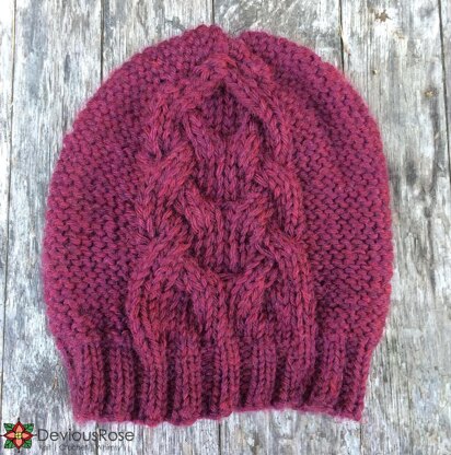 Bordeaux Cabled Hat features a bold, 18-stitch cable that can be worn toward the side or centered. It can be made with a slight slouch or as a classic, non-slouchy beanie. The design is unisex and makes a perfect stuff-in-your-bag sort of hat, even with the elegant cable. Plus, bulky yarn makes it good gift knitting!