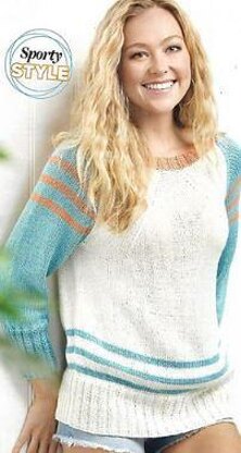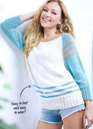 This is a pattern for a border stripe jumper, originally published in Lets Knit. It is in stocking stitch, with raglan sleeves, 2 x 2 rib edges and stripes. It would be fine for a beginner able to do the shaping and picking up stitches for the neckband. Photos Lets Knit.