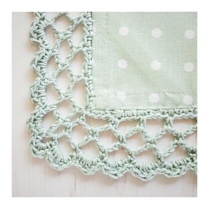 Requirements: 4mm Crochet Hook, 75g DK Mercerised Cotton Yarn, Sewing Needle, Darning Needle, Fabric item (bag/tea towel/pillowcase)