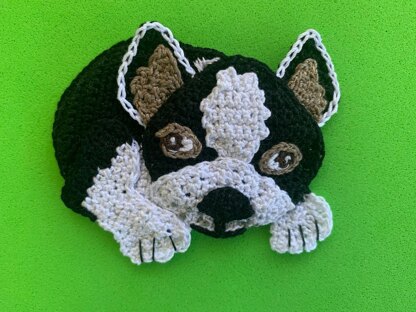 This is the pattern for a Boston Terrier appliqué. I do have this pattern available for free on my website if you would prefer that option. The link is down below, but I’ve made it available for people to download as well for $1 on Ravelry.