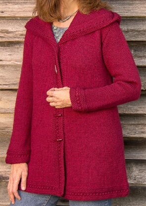 This coat is worked from the top down, beginning at the back shoulders. The back is worked to the armholes, then placed on hold while the fronts are picked up from the back shoulders and worked to the armholes. Then the back and fronts are joined and the body is worked to the bottom edge. The sleeves are picked up from the armholes and worked to the cuffs, with short-row shaping to shape the sleeve caps. The hood is picked up from the neck edge and worked to the top, with short-row shaping, then the top is joined using Kitchener stitch or 3-Needle Bind-Off. The edging around the hood and bottom of the body is worked around the entire piece, so it is very long; you will need to work it over 3 circular needles, using a fourth as your working needle.
