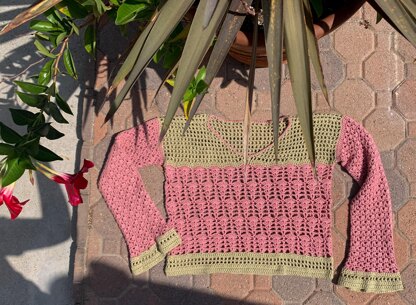 This pattern is worked from the bottom up in a crochet lace pattern. Sleeves are worked in the round in a different lace pattern. The construction is a drop shoulder top with narrow sleeves that widen into a slight bell sleeve.