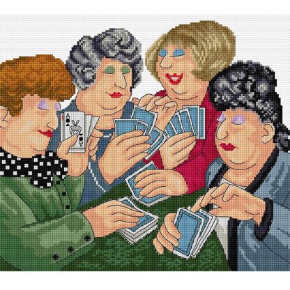 Beryl Cook A Full House. Your kit contains: 14 count white Zweigart Aida, pre-sorted stranded cottons, needle, stitch diagram and instructions. Finished size 28cm by 25cm. This kit uses full cross stitches, fractional stitches and back stitch.
