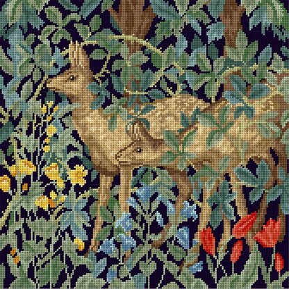 William Morris Tapestry Greenery Deer. Your kit contains: 12 count full colour printed Zweigart interlock canvas, Anchor tapestry wools, needle, stitch diagram and instructions. Finished size approximately 14 inches square. Cushion backing and pad are not included.