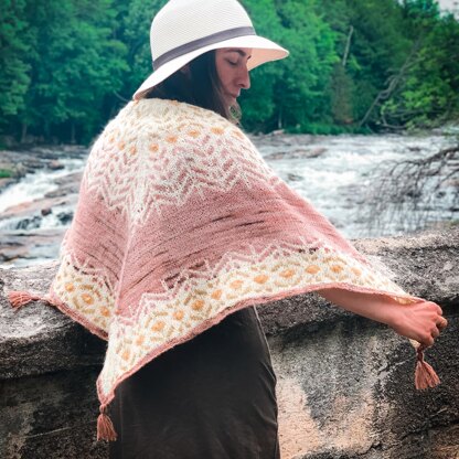 This shawl is worked from the top down, using the stranded colorwork technique, stockinette stitch and ribbing. It is made of three or four colorways of fingering to DK weight yarn. It is adaptable in size, as you can make the stockinette section as big as you desire.