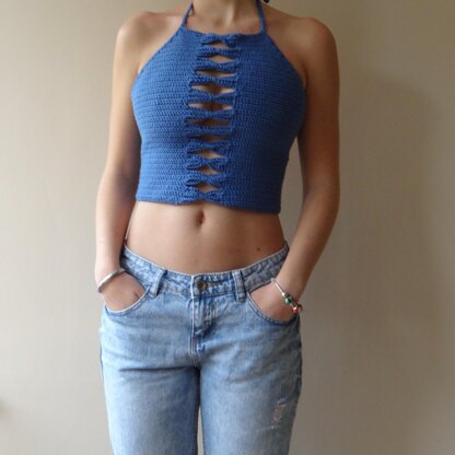 Stand out this summer with this fun, unique halter top. With a corset back and tie neck this top is easily adjusted to get the perfect fit. The striking bow detailing is created using a simple repeat of chains and slip stitches. This pattern uses basic crochet stitches and simple decreases.