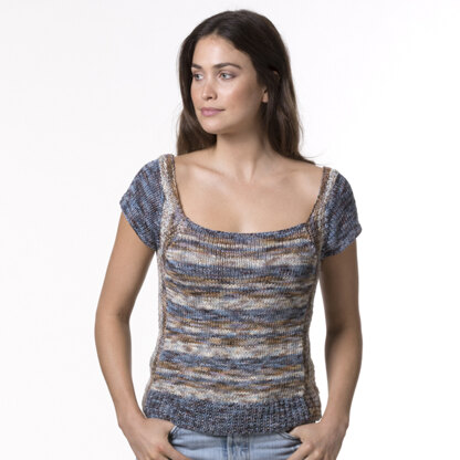 Tahki Yarns Bower Shell designed by Irina Poludnenko is worked in sections, starting with the center section of the back. The side sections of the back piece are picked up and worked out. The front is worked the same as the back. Sleeves are worked separately. Three coordinated shades of Tahki Yarns Tandem are artfully combined to create this fitted top, which presents horizontal stripes in the center panels, accentuated by slimming vertical stripes on the side segments. Solid-color cap sleeves finish the look.