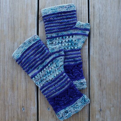 The beginning of the cuff of the mitts is knit flat, then joined and knit in the round to the top. Charts and written instructions are provided to work the lace motif at the wrist. Increases are worked on either side of the center thumb stitch and then removed to waste yarn while the remainder of the mitt is worked. Those stitches are picked up and worked at the end to form the thumb.