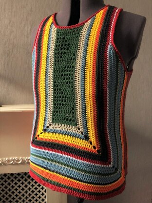 A bright and colourful tank top, in stripes round a central zig zag panal. Made from DK cotton, the total weight is about 350g, but that is for eight colours used in the pattern.