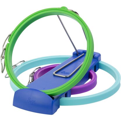 Three different size hoops in one easy to use and store stand. This 10x11.625x1.75 inch package contains one 5 inch hoop, one 7 inch hoop, one 9 inch hoop, one adjustable stand and one sturdy housing base with an easy open spring hinge. Imported.