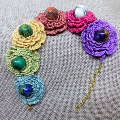 An elegant and impressive bracelet, both original and romantic. The flowers that make up the bracelet are inspired by a traditional Irish crochet pattern. The technique of attaching the flowers to each other allows the bracelet to surround the wrist without leaving an empty space between the flowers, which makes it more beautiful. It can also be used to hide the sewing threads of the beads. The proposed model can be adapted in different ways, according to everyone's taste. It can be made in a single colour rather than with flowers of different colours. The size of the beads to be inserted can also be smaller to give a more classic bracelet. The realization is not difficult, it only requires regularity in the work and an understanding of the technique of making the flower. All this is explained, anyway, in the tutorial in detail. The PDF tutorial includes a main diagram and 11 detail diagrams as well as a step-by-step explanation with 45 photos.