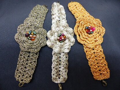 A very spectacular and original bracelet that is however quite easy to make. It consists of a flower based on the traditional pattern of the Irish rose, mounted on a bracelet with an openwork stitch that offers good elasticity and allows a good adaptation to the wrist. The beauty of the flower is enhanced by the addition of multicoloured pearls. The bracelet is photographed here in 2 versions: one made with a shiny metallic thread, the other with a multicoloured cotton thread. The size of the hook used will give a greater or lesser stiffness to the jewel (the smaller the hook, the more rigid the jewel). The PDF tutorial includes a main diagram and 4 detail diagrams as well as a step-by-step explanation with 14 photos.