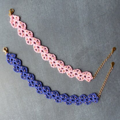 A thin and elegant bracelet, enhanced with pearls. It is presented here in pink or blue, perfect colours for summer. The bracelet motif is inspired by Romanian lace techniques and features a modernised version of crochet lace. The pearls inserted can be of different styles (here, Japanese Miyukis, flat and in metal). The realization is not difficult, it only requires regularity in the working process. You just have to learn how to insert the pearls, which is detailed in the tutorial. Explanatory videos can also be found on Oito Crochet's Facebook page. The model photographed is made of medium pearl cotton (10) but can also be made with a thinner pearl cotton (20) to give it a more sophisticated look. The PDF tutorial includes a main diagram and 9 detail diagrams as well as a step-by-step explanation with 25 photos.