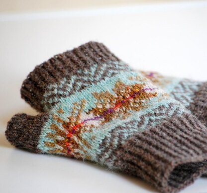 Perfect for fall, these little fair isle mitts are knit in shades of rust, brown and cream, with flashes of purple and orange, set against a background of turquoise blue. They have a thumb gusset and there are charts for left and right hands. One size to fit woman’s hand circumference 7-7.5 inches (18-19 cm).