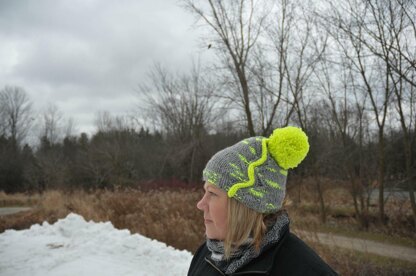 Knit up in lightweight bulky yarns, this hat is done in a flash. Add a ridiculously large pom pom to finish it off.