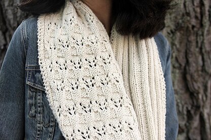 It’s soft and round, and just a bit rustic. To allow the character of the yarn to stand out, I chose strong lines in a simple ribbing, paired with an alternating lace motif that plays off the proportions of the ribs. The cowl is worked in ribbing for one third of the length, and then in lace for the remaining two thirds so you get a bit of contrast between the textures when worn either long or wrapped.