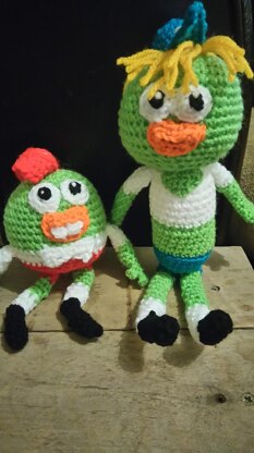 This pattern is based on the two main characters of the cartoon Breadwinners. Buhdeuce and SwaySway It was a custom made piece that I decided to write up and offer to others to make their own. It uses crochet in a round technique so be sure to use your stitch marker. It requires green, yellow, blue, red, white and black yarn all of which uses less that 100g ball. My first paid pattern so any issues please message me. Any photos of your finished items will be greatly appreciated to add to this page if you wish as I experienced camera issues when creating this pattern.
