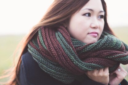 The knitting is easy, although almost all the techniques may be new to most knitters. This is a super cozy, oversized cowl that will shelter you from the fiercest of storms. The double garter stitch pattern is worked on every one of its 52 rows. The two selvedge ends are joined together in an intriguing and attractive double bind-off similar to three-needle bind-off.
