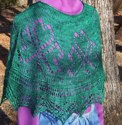 Starting on smaller needles (to avoid a too-large neck-opening), the poncho grows to incorporate six shamrocks round the body with a lace-edging that adds length while binding-off the live stitches.