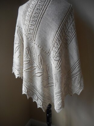 4 different lace leaf patterns create this asymmetrical constructed shawl. The final leaf pattern is added by picking up stitches on the left hand needle from the last row of stitching. Shawl is knit in one piece, no seams!