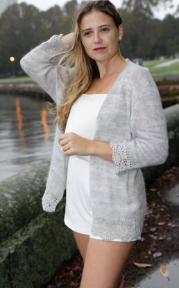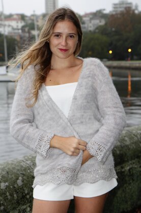 Breezy Nights is a lightweight cardigan which is worked in lace weight baby suri alpaca and silk yarn. The design includes beautiful lace hem, cuffs and neck trims in fingering weight yarn which add timeless elegance to a garment that is already so soft and alluring. Designed to add an element of glamour to your warmer weather wardrobe, Breezy Nights is the perfect garment to throw on as the heat of the day drops, leaving you a little cool and wishing for a touch of fuzzy alpaca silk over your shoulders!