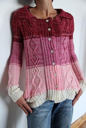 The cardigan is knitted seamlessly flat, from top to bottom. You can use one color or more according to your desire. Melange cable and rib, you will not get bored in the knitting