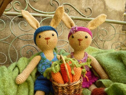 A bunny doll pattern that comes complete with instructions to crochet a full set of clothes for both a girl and a boy. Brenda wears a flower headband, pink waistcoat, frilly skirt and cute little Mary-Jane shoes. Benjamin has a visor, blue waistcoat, shorts and cross-laced shoes. Also included is a pattern for a bunch of carrots because a hungry bunny is not a happy bunny!