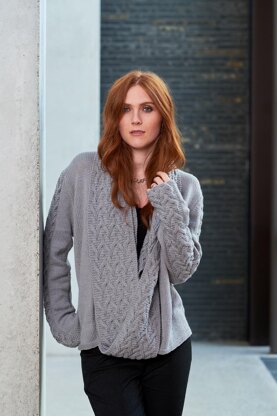 Notes: The body is worked back and forth in one piece to the armholes and then the fronts and back are worked separately. The sleeves are worked in the round, with the sleeve cap worked at. The loop cowl is worked in two parts, with 3 pattern repeats, and is joined with a 3-needle bind o at one end and a mattress stitch seam at the other after it has been attached around the opening with extra length hanging loose.