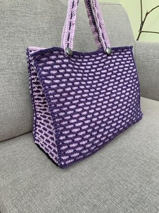 The pattern is made up of knit, purl and slip stitches and knitted as one flat piece. The side gussets and handles follow the same pattern but reversing the colours and attached afterwards.