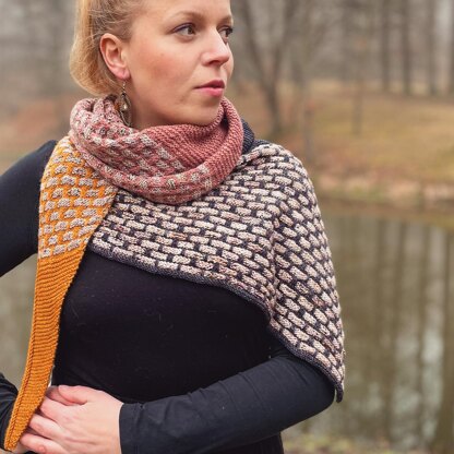 The shawl is knitted sideways and with the following techniques: knitting, purling, increases, slip stitches, yarn overs, I-Cord Bind-Off.