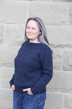 This sweater is worked in the round from the top down. Short rows are used to gently shape the back neckline. A textured pattern is worked on the front and back of the yoke and continued down the body of the sweater. The sleeves are knit in stockinette stitch and finished with ribbing.
