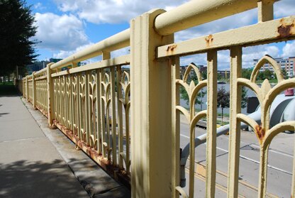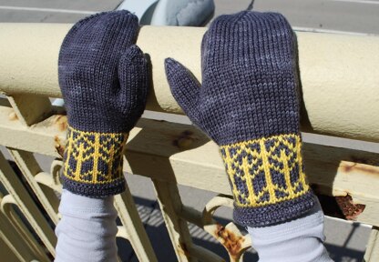 Designed to coordinate with the Bridge Walker Hat these mittens feature a stranded colorwork motif on the cuff that echoes the metal work used in some of Pittsburgh's bridges and riverside walkways. These mittens are knit from the cuff up in the round, starting with a hemmed edge. Once the mittens are complete, an optional ribbed lining can be added. The mittens are interchangeable -- i.e., either mitten can be worn on either hand.