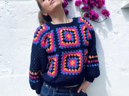 This crochet pullover is colorful, unique and bold. It's an intermediate level pattern. You can crochet it in any size or color combination. You can easily adjust the pattern to your own preferences. The body of the jumper is made out of 14 granny squares and the sleeves are added later. Feel free to use the yarn and matching crochet hook of your choice to make the sweater. The result will be bigger or smaller keeping the same proportion.