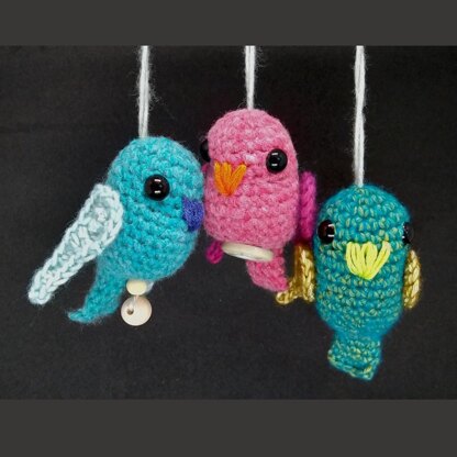 Materials: They use tiny amounts of yarn - less than 10g per bird, a little bit of toy stuffing, 9mm safety eyes and 51cm of embroidery thread. Also, buttons or beads and thread, ribbon or string for hanging.