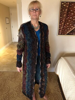 A long evening coat, you will be the envy of many This coat will fit most people, smaller size can be available, contact me. Length is about 54 inches, to make shorter eliminate one chevron repeat or two, depending on your height. A short version of this coat is available in my store. Fun to make, chevron pattern and big needles makes this a fast project. Working with Prism stuff makes it elegant