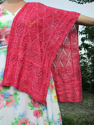 Bring me Flowers is composed of a border with flower bouquets and a flower sprinkled trellis center. The stole can be enlarged or made smaller by adding or retracting repeats to the length and width. The pattern is charted, wrong side rows are a combination of knits and purls.