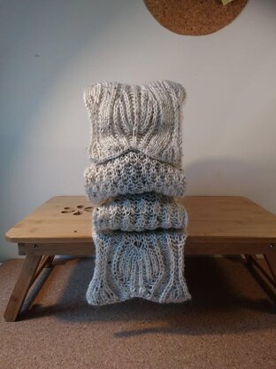 The fabric is equally beautiful in a solid, traditional “Aran tweed colour” such as here, or in a variegated yarn (a yarn which changes colour within the strand).