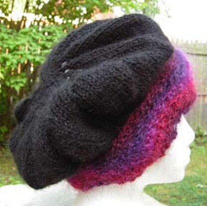 A hat with a fitted brim and a “poofy" top that won’t crush your hair; brim is knit in a contrasting variegated yarn of a lighter weight.