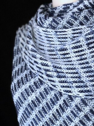 This shawl alternates between single-color and bi-color brioche. You will need twice as much yarn of one color as the other, but whether you opt for more light than dark or more dark than light is entirely up to you.