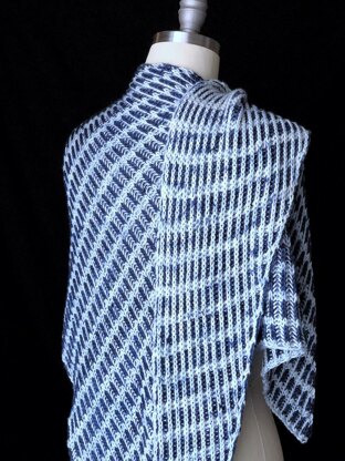 Inspired by the interrupted stripe patterns that emerge from the Arashi technique of Shibori dying, this asymmetrical triangular shawl is completely reversible with a dark side and a light side that are equally attractive. It can easily be made larger or smaller by simply repeating the pattern rows more or fewer times.