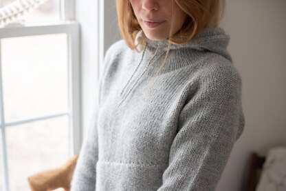 When I was in my teens, one of my dear father's "life tips" was to teach me how to grill the perfect burger. How I loved those perfectly done burgers, scented with smoky wood chips on clear, chilly nights at camp. The melted cheese and the chirp of crickets saying goodbye to summer as we sat and ate, listening to the calm water lap at the shores below. All my favorite things to wear at that time were baggy and cozy- much like this pullover. It has a drawstring hood and a diagonal stockinette change for interest.