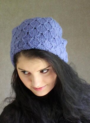 Pretty lattice-stitch hat with a hemmed band. The stitch patterns are my own dutch-style versions of the classic broderie anglaise (English embroidery) stitch, and use the same techniques along with some new moves.