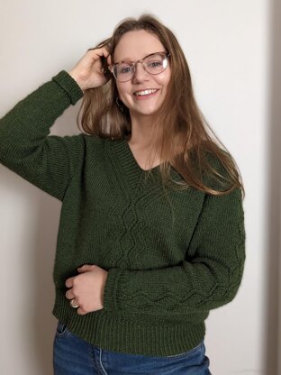 I have always liked the look of cable patterns but find using a cable needle a bit of a bother. I always lose my cable needle and find that searching for it breaks the rhythm of my knitting. So, anything that looks like cables but doesn’t need a cable needle is a win! This top down, v neck, relaxed fit raglan sweateris decorated with mock cable patterns of twisted stitches at centre front and down the sleeves. Tutorials are given in the pattern for twisted stitches, casting on over a gap, and stretchy bind-off. The twisted stitch panel is worked from a chart or written instructions. The Ness of Brodgar is an amazing Neolithic site in Orkney where there are stone carvings which inspired the panels on this jumper.