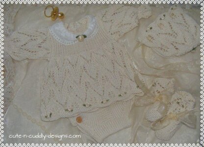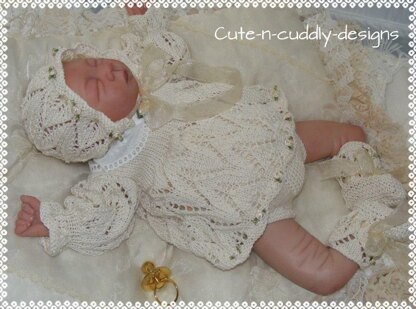 THIS PATTERN IS DESIGNED TO BE LIKE A VINTAGE STYLE , AND YOU CAN ADD A BOUGHT COLLAR FOR EFFECT . THE PATTERN CONSISTS OF AN ANGEL TOP, NAPPY COVER THAT BUTTONS UP BOTH SIDES , BOOTEES AND BONNET . THE PATTERN IS FOR D.K YARN AND WHEN KNIT WILL FIT A BABY UP TO APPROX 10LB IN WEIGHT OR WILL FIT A REBORN/DOLL 18-22 INCH IN LENGTH .